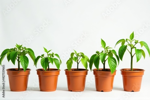 Several healthy tomato plants in individual pots against a pure white backdrop , vegetable, summer