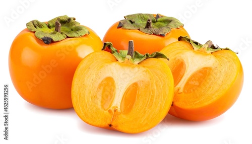 fruit, persimmon, orange, ripe, food, healthy, sweet, fresh, nature, autumn, organic, juicy, vibrant, detail, closeup, isolated, white, background, colourful, macro, vitamin, delicious, texture, smooth, skin, edible, section, plant, dessert, breakfast