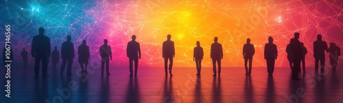 silhouette, people, standing, colourful, background, group, friends, diverse, multiracial, oneness, together, harmony, community, happiness, joy, positivity, vibrant, bold, bright, shadow, outline, figure, teamwork, collaboration, sharing, culture, connection, support, relationship, outline, profile, diversity, fun