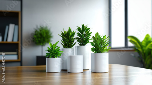 Several small green potted plants arranged on a wooden table in a modern office with natural lighting.