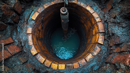 Sewage pipe pumping machine in brick well. Sewer cleaning service. Sanitation infrastructure, wastewater removal. Waste management. Water utility maintenance. Environmental protection. Industrial.