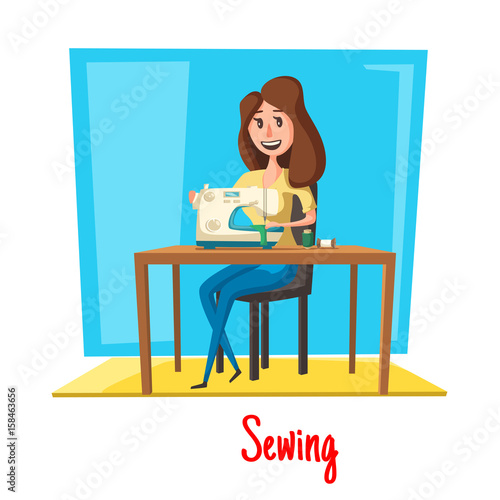 sewing, woman, tailor, dressmaker, tailoring, fitting, poster, vector, atelier, designer, salon, pin, fashion, profession, sewing machine, sew, dressmaking, workplace, dress, apparel, scissors, needle, modiste, hairdresser, studio, wear, cutting, occupation, thread, craft, clothes, hand-made, young, smiling, clothing, workshop, fabric, work, design, sewing, character, flat, illustration