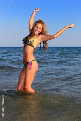 Sexy bikini model having fun in the ocean