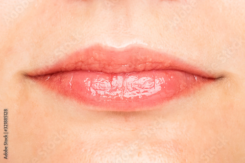 Sexy lips. Macro of the female part of the face. Beauty pink lips makeup detail. Lipstick and lip gloss. lip correction