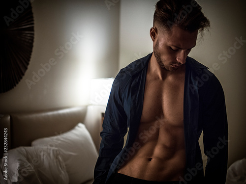 Sexy male model standing alone on bed in his bedroom, looking at camera with a seductive attitude,, with shirt open on muscular chest and torso