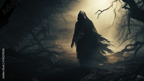 Shadow, old cloak, Grim Reaper silhouette creeping through foggy graveyard at night, moonlit sky, 3D render, backlighting, motion blur, Macro shot