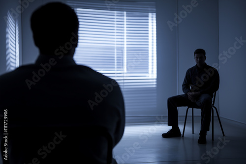 interrogation, mystery, suspense, cinematic, tension, shadow, crime, thriller, investigation, drama, atmosphere, police, suspect, detective, isolation, psychology, black, scene, storytelling, moody, silence, confrontation, questioning, shadow, intense, introspection, confinement, sharpened, minimalism, psychological