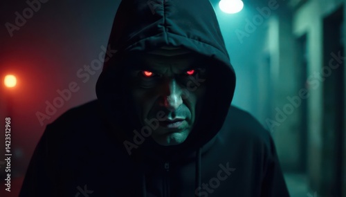 Shadowy figure, piercing gaze, sinister expression, piercing stare, deep shadows
