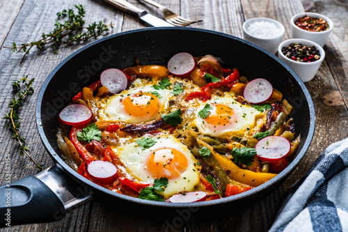 Shakshuka - fried eggs with vegetables in frying pan