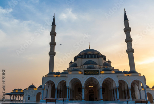 Sharjah, UAE - 07.31.2021 - Sharjah mosque at evening hour. Religion