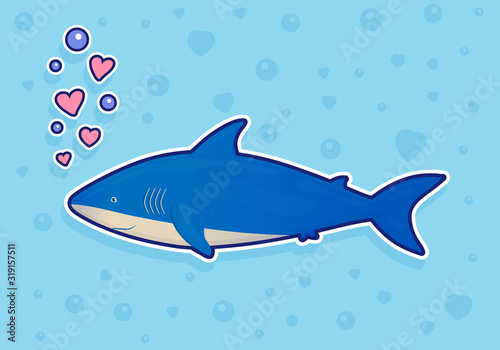 Shark sticker on blue background with bubbles and hearts. Ocean fish. Underwater marine wild life. Vector illustration.