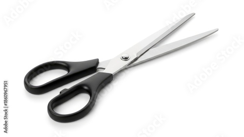 Sharp black-handled scissors with silver blades, open and isolated on a clean white background, ready for various cutting tasks.