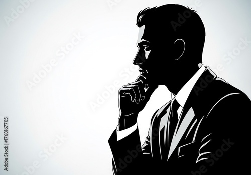business, man, silhouette, thinking, contemplation, strategy, decision, professional, modern, corporate, executive, thoughtful, serious, concept, idea, planning, success, leadership, sharpened, insight, intelligence, analysis, consideration, pondering, entrepreneur, career, ambition, wisdom, profile, head, suit, attaching, gesture, hand, chin, black, white, minimalist, graphic, clean, sharp, determined, confident, decisive, deep