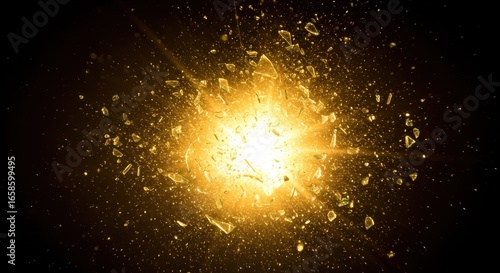 explosion, shattered, gold, shard, light, bright, burst, aglow, radiant, energy, power, force, impact, debris, fragment, piece, glasses, texture, abstract, graphic, design, digital, background, pattern, dark, black, yellow, orange, gold, sparkle, shine, glamour, metallic, bursting, radiating, center, sharpened, dynamic, intense, powerful, dramatic, high-coloured, spectacular, effect, illustration, composition