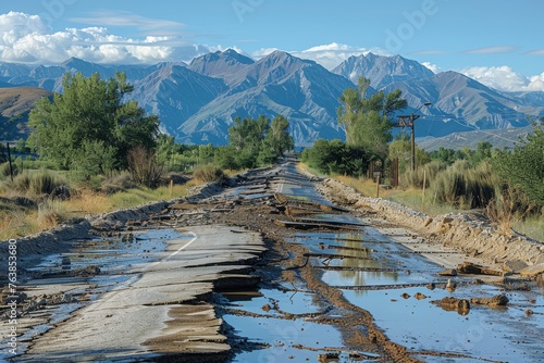 roadway, shattered, mountain, view, water, puddle, horizon, beautiful, desolation, adventure, survival, landscape, nature, travel, journey, environment, scenic, rural, weathered, damaged, terrain, route, dramatic, exploration, desolate, remote, cracked, infrastructure, perspective, wet, rugged, scenic route