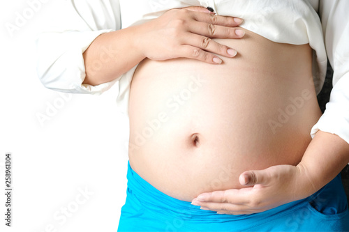 She have a baby. Woman is pregnant touching belly with love of mother and baby. Relationship during family concept , Health concept.