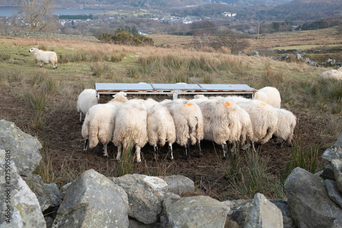 farm animal, agriculture, farming, animal, sheep, metal, feeder, eating, wall, stone, grass, reed, field, flock, ewe, animal, farm, grazing, wool, countryside, mammal