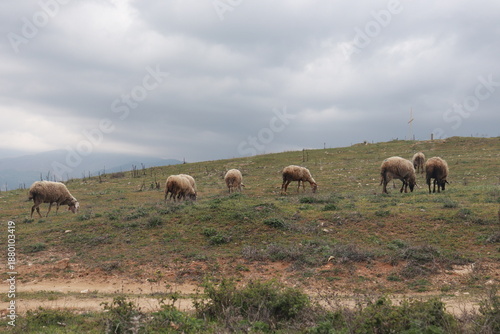 sheep, farm animal, farm animal, agriculture, farming, pastoral, countryside, meadow, hillside, pasture, animal husbandry, nature, outdoors, cloudy sky, spring, bulgaria, east europe, calm, peaceful, documentary