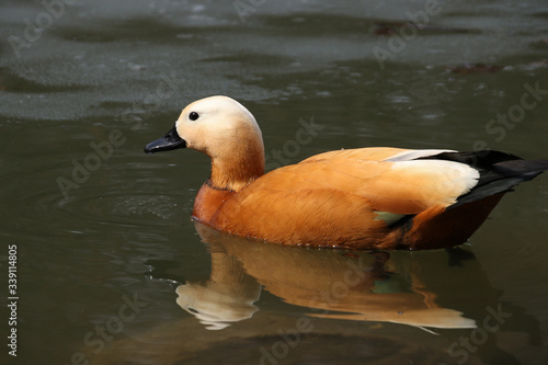 Shelducks male swims in the spring in a pond in sunny weather in the Moscow region