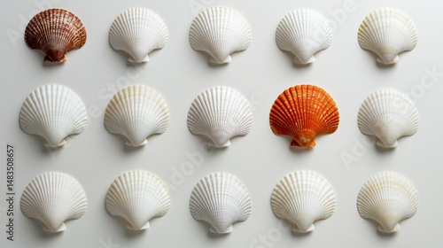 shell, shape, white, grid, seashell, unique, colours, symmetric, pattern, background, brown, orange, 1, size, curvature, rounded, arrangement, appealing, harmonious, display, white background