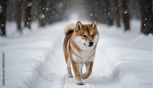 Shiba inu walking in snow - ultra realistic photo