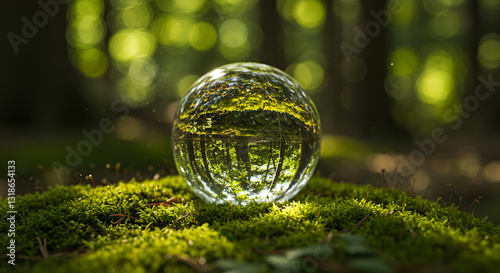 shimmering glass sphere sits gracefully on a cushion of emerald moss, reflecting the intricate beauty of a forest's towering trees and verdant foliage."*
