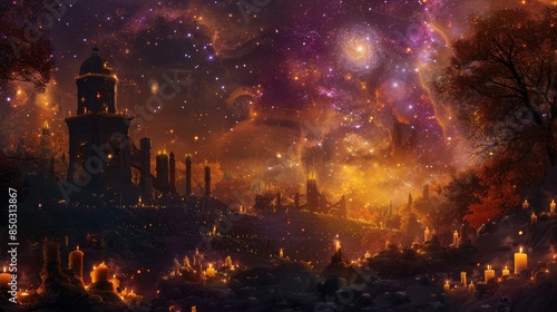 Shimmering stars and swirling galaxies create a celestial Day of the Dead sky background