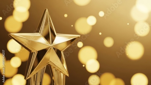 Shining golden star trophy against a shimmering golden bokeh background.
