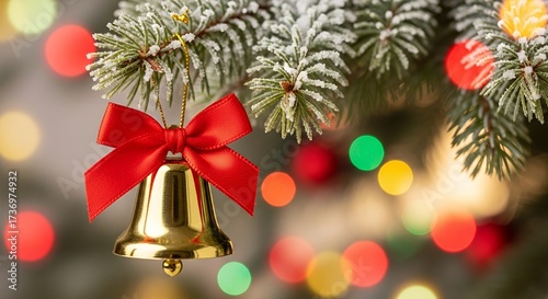 Shiny golden Christmas bell with a red ribbon hanging from a snow-covered fir branch. glow with warm, festive bokeh lights, perfect for holiday cards.