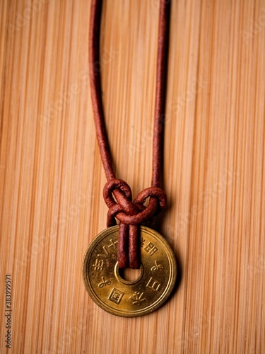 Shiny Japanese Coin Knotted Leather Necklace Closeup
