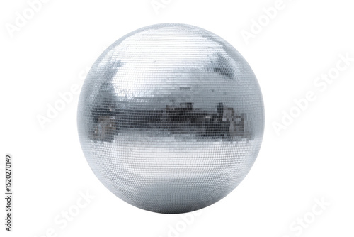 Shiny silver disco ball with reflective glass tiles on black background, cut out