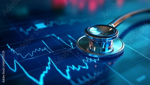 Shiny Stethoscope Detail on Blue EKG Graph Background CloseUp Medical Scan Report