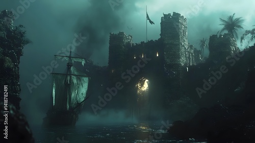 castle, ship, water, fog, sea, ocean, fortress, night, mystic, magical, fantasy, dark, gate, sailing, journey, adventure, mystery, ancient, tower, wall, stone, ruin, island, tropical, palm, tree, archway, light, glow, shadow, silhouette, artwork, digital, art, concept, illustration, three-dimensional, rendering, blue, green, teal, painting