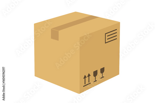 Shipping box vector illustration. Closed cardboard carton for delivery, moving, and packaging. Parcel with fragile and this side up symbols. Isolated logistics icon.