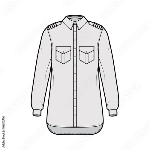 Shirt pilot airline technical fashion illustration with chevron, long sleeves with cuff, angled flap pockets. Flat apparel top outwear template front, grey color. Women men unisex CAD mockup