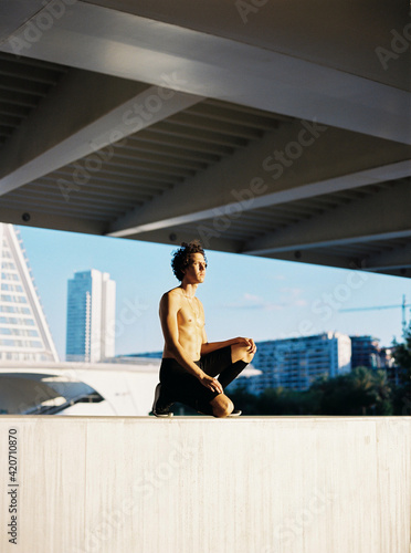 activity, athlete, barrier, body, border, building, city, construction, contemporary, curly hair, daytime, energy, exterior, fit, fitness, full body, full-length, kneel, lifestyle, model, modern, outdoors, power, relax, rest, roof, shirtless, slim, sport, street, structure, summer, sunny, torso, town, urban, vertical, vitality, well-being, wellness