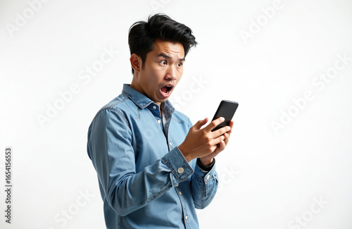 Shocked Asian man with open mouth stares at mobile phone in blue shirt. He displays wow face expression, engrossed in online shopping or surprising news. Shows emotion, technology use.