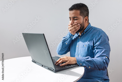 shocked, surprised, mistake, error, gasp, reaction, bankruptcy, bad news, laptop, computer, shame, blunder, technology, seated, desk, table, professional, business, digital, screen, adult, male, casual attire, indoor, white background, corporate, entrepreneur, employee, men at work, worried, beard, shirt, modern, electronic, consulting, developer, online, secret, security, scam, virus, accidental, oops, privacy, revelation, web, caucasian
