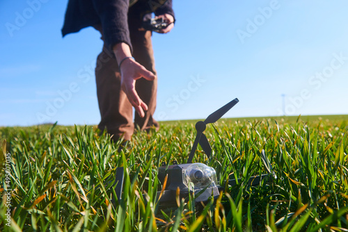 shocked man with broken drone. Worried man with crashed gadget. Excited young man (disappointed man) with drone which falls down on field. Selective focus to foreground