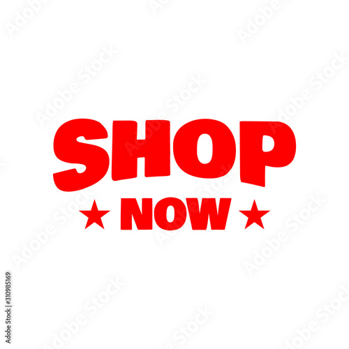 Shop now button lettering text vector design with business symbol icon template for banner site page website element