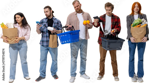Shoppers holding grocery bags and receipts with frustrated expressions. Concept of food price inflation, family budgeting, consumer stress, and cost management challenges. Transparent background