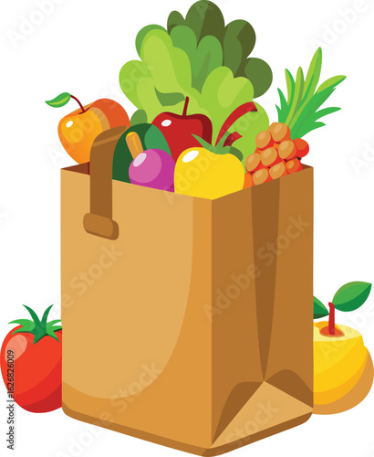 food, bag, vegetable, fruit, vegetable, paper, grocery, isolated, healthy, vector, apple, tomatoes, shopping, fresh, organic, red, diet, pepper, orange, grocery, fruit, vegetarian, white, set, illustration