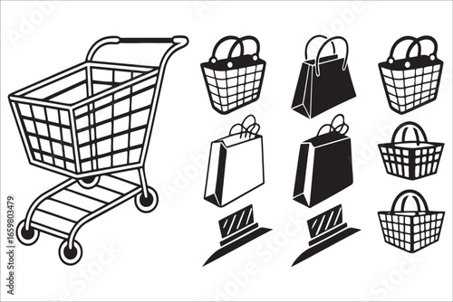 shopping, cart, streetcar, basket, bag, grocery, supermarket, retail, market, paper, tote, pursed, purchase, commerce, consumerism, sale, discount, promotion, deal, offer, store, shop, business, online, e-business, delivery, package, gift, present, buyer, client, consumer, product, item, merchandise, order, checkout