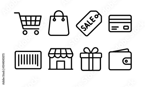 shopping, icon, set, cart, bag, sale, tags, credit, card, barcode, store, gift, billfold, commerce, retail, buy, purchase, transaction, checkout, symbol, payment, market, shop, trade, consumer, e-business, good, merchandise, discount, basket, icon, simple, line, modern, graphic, design, illustration, black, white, finance, banking, present, commercial
