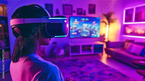 woman, technology, person, people, closeup, copy space, copy space, space, tech, high technology, television, television, purple, neon light, ar, virtual, reality, ai, artificial intelligence, artificial, intelligence, light, three-dimensional, night, indoor, home, modern, sofa, sitting, interior, light, cyberspace, illustration, digital, room, screen, future, futuristic, headset