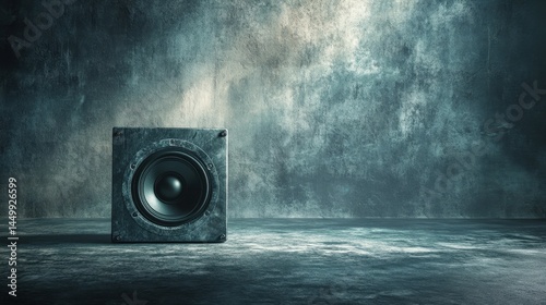 Shot of a subwoofer with visible speaker cone on a dark, moody backdrop