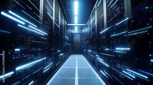 Shot of Corridor in Working Data Center Full of Rack Servers and Supercomputers with Internet connection, Generative AI