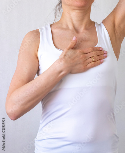 Shot of the woman in the white top against the white wall, performing self examination of the breasts, looking for abnormalities. Cancer awareness