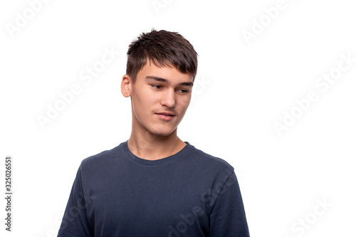 Shot of the young boy teenager of the brunette wearing blue shirt, isolated