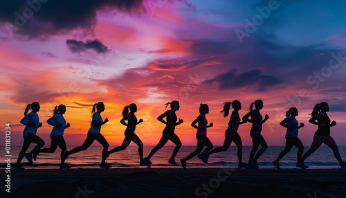 showing a group of mature women jogging along a beach at sunrise, their silhouettes against the colorful sky, symbolizing vitality and the start of a new day, Running, Group Of Peo